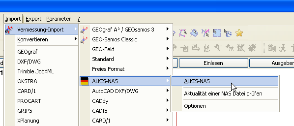 Zuerst sind die Bestandsdaten zu importieren, d.h. die mit der Vorbereitung erhaltenen ALKIS-Daten: