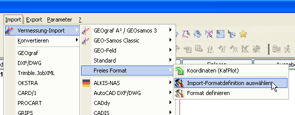 Um die mit KafPlot erstellten Fortführungsdaten importieren zu können, muss in Geograf einmalig die Formatdefinition ausgewählt werden: