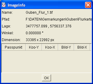 Der Punkttrafoinfodialog wird aufgerufen, indem mit dem Werkzeug Punkt markieren mit der rechten Maustaste auf einen Punkt geklickt wird. Es werden alle Parameter zur Transformation des Punktes aufgezeigt.
