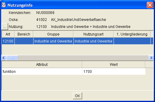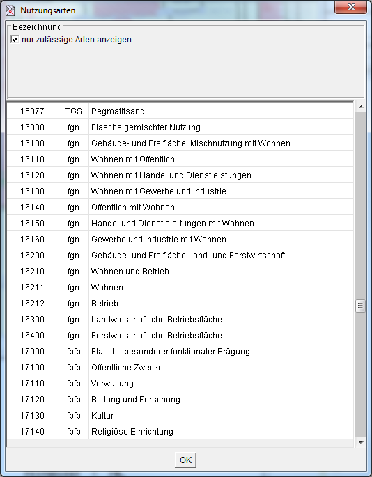 Dieser Dialog enthält ein Verzeichnis sämtlicher Nutzungsartenschlüssel mit ihrer Bezeichnung.