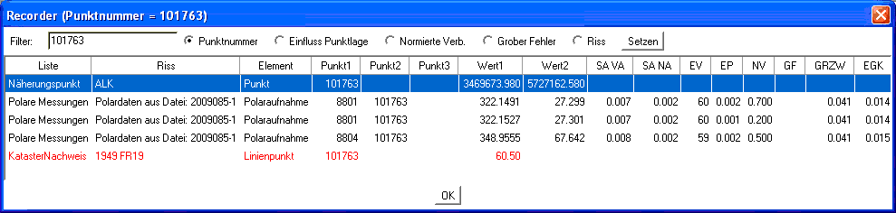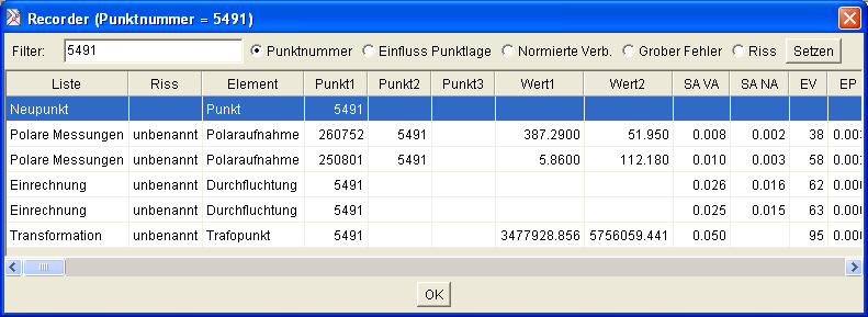 Der Punktrecorderinfodialog wird aufgerufen, indem mit dem Werkzeug Punkt markieren mit der rechten Maustaste auf einen Punkt geklickt wird. Hier werden alle Messungen angezeigt, durch welche der Punkt bestimmt wurde.