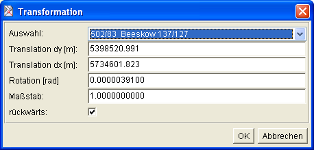 Der Schalter rückwärts ist für die Transformation von lokalen Systemen nach Gauß-Krüger zu setzen. Für Transformationen von Gauß-Krüger in lokale Systeme bleibt der Schalter frei.