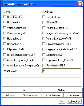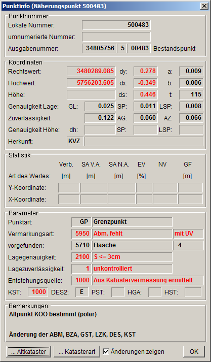 Über den Schalter Alt-/Neukataster kann zwischen den ursprünglichen und den neuen Parametern des Punktes umgeschalten werden, über den Schalter Kataster-/interne Art zwischen eben diesen. Ist der Schalter Änderungen zeigen