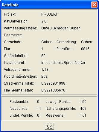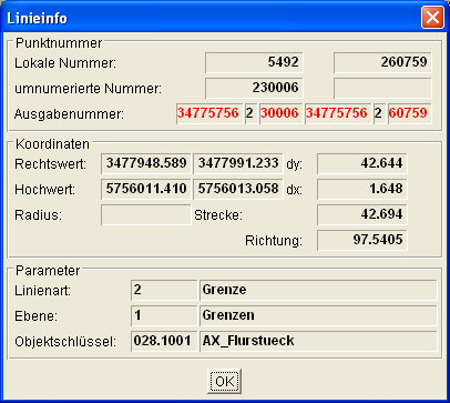 Der Punktinfodialog wird angezeigt, wenn ein Punkt mit Doppelklick markiert wird. Es werden alle wichtigen Parameter eines Punktes aufgezeigt. Für Katasterpunkte wird das vollständige