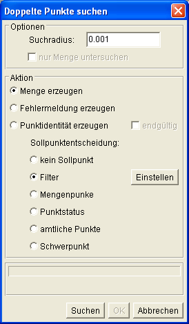 Hiermit kann eine Menge aus einer Punktdatei erzeugt werden. Es werden alle ProjektPunkte der Menge hinzugefügt, deren Punktnummer in der Datei vorhanden ist. Die ProjektPunkte bleiben unverändert, es werden also keine Daten aus der Datei gelesen. Zusätzlich kann der Schalter gesetzt werden, der Punkte mit identischen Koordinaten nicht in die Menge einfügt.
