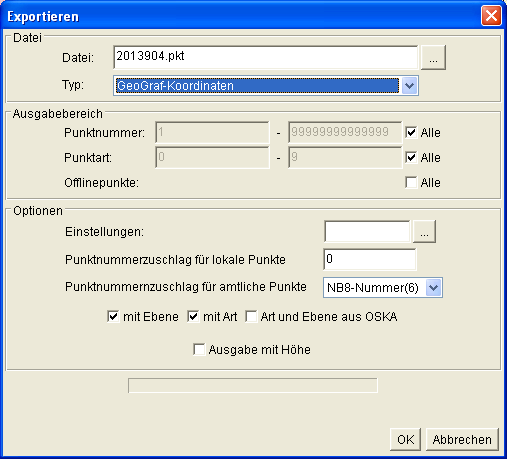 Im Feld Datei kann der Dateiname und das Ausgabeformat festgelegt werden. Im Feld Ausgabebereich kann ein zusätzlicher Punktfilter festgelegt werden. Damit werden nur Punkte ausgegeben, die die eingestellten Parameter erfüllen. Der Filter läßt nur für das Ausgabeformat gültige Werte zu. So können z.B. in die amtlichen Formate nur Punkte der Punktart 1 bis 9 ausgegeben werden. Soll die Auswahl ignoriert werden, ist das Auswahlfeld alle anzuwählen.
