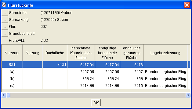 Dieser Dialog wird aufgerufen, wenn auf ein markiertes Flurstück doppelt geklickt wird. Er stellt das Stammflurstück mit allen Teilstücken zusammen.