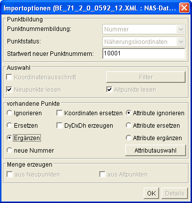 Hier besteht die Auswahl, in welcher Form und Läge die Punktnummern amtlicher Punkte importiert werden. Der Punktstatus, mit welchem die Punkte übernommen werden, kann ausgewählt werden. Für doppelte oder in der Grafik vorhandene Punkte kann vereinbart werden, ob diese beibehalten, überschrieben oder deren Parameter ergänzt werden sollen. Wird der Schalter Koordinatenausschnitt aktiviert, werden nur Punkte eingelesen, die innerhalb der in der Auftragsdatei vorhanden Geometrie liegen.