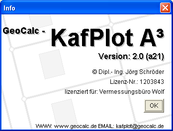 Der Dialog enthält Informationen zur KafPlot-Version und zur Lizenzierung.