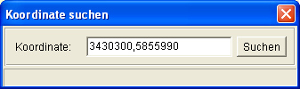 Mit diesem Dialog kann nach einem beliebigen Koordinatenpaar gesucht werden. Die Koordinaten sind auf Meter gerundet einzugeben; Rechts- und Hochwert durch ein Komma zu trennen. Auch die Suche nach geografischer Länge und Breite ist möglich. Ebenso können aber auch beliebige Zeilen aus Dateien, z.B. den Error-Dateien, als Suche eingegeben werden. KafPlot sucht sich aus der Zeile das Koordinatenpaar heraus.