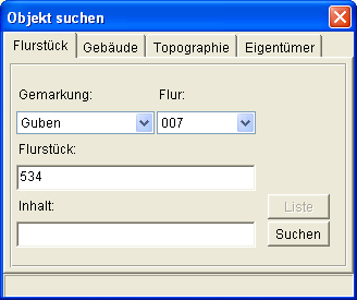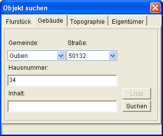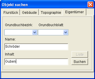Das Eingabefeld Name durchsucht die Eigentümerangaben. Es können mehrere Suchbegriffe wie im obig beschriebenen Feld Inhalt eingegeben werden. Das Feld Inhalt sucht alle ALB-Angaben, findet als zB. auch Anschriften und Postleitzahlen.