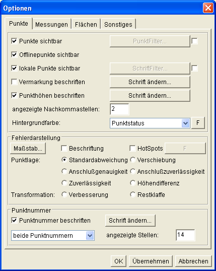 Im Feld Punktnummer kann eingestellt werden, ob und mit welcher Stellenanzahl Punktnummern (lokale oder umnummerierte) dargestellt werden sollen. Die Darstellung dieser Texte kann mit dem Schalter Schrift ändern beeinflusst werden.