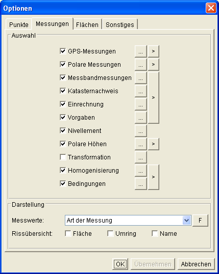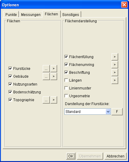 Im Feld Flächen kann eine Auswahl der darzustellenden Flächen vorgenommen werden, wobei bei der jeweiligen Art mit