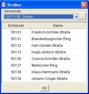 Der Dialog ist eine Auflistung aller in der strassen.propertis enthaltenen Straßen.