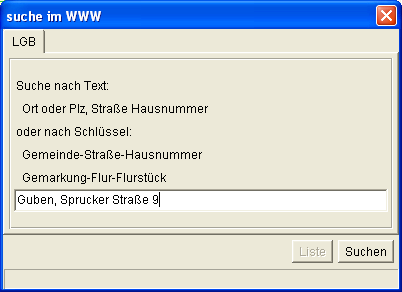 Hierbei handelt es sich um eine Anbindung an den Gazetteer der LGB. Das ist eine Suchmaschine zum Abfragen verschiedener Features, unter anderem Gemeinden, Gemarkungen, Gebäudeadressen. Für die Funktionsweise dieser Suchmaschine gibt es leider keinerlei Informationen. Ich hoffe, dass die Suche ähnlich einfach zu bedienen ist, wie zB. Google. Über Rückmeldungen zu Erfahrungen wäre ich sehr dankbar.