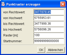 Im Dialog ist der Bereich des Rasters, die Rasterweite, sowie die erste zu vergebene Nummer der zu erzeugenden Punkte einzugeben.
