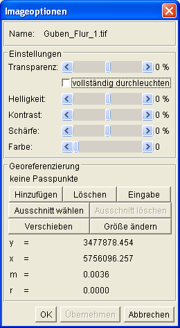 Es ist aber auch möglich, die Transformation über Passpunkte herzustellen. Die Passpunkteingabe wird mit dem Schalter Hinzufügen im Imageoptionen-Dialog gestartet. Nacheinander werden Bild- und Passpunkt abgefahren, beachten Sie die Angaben in der Statusleiste. Sollte während der Passpunktwahl ein Zoomen notwendig sein, setzen Sie die Mauswahl durch Mausklick auf das Eingabesymbol (Bleistift) fort. Abgeschlossen wird die Passpunktwahl durch rechten Mausklick. Sie kann jederzeit forgesetzt werden durch Anwahl des Schalters Hinzufügen.