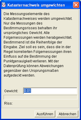 Unter Extras ist der Dialog "Katasternachweis umgewichten" zu finden. Hiermit werden die Messungselemente des Katasternachweises umgewichtet. Nur die Messungen des Bestimmungsrisses behalten ihr ursprüngliches Gewicht. Alle Folgemessungen werden herabgewichtet. Bestimmend ist hierbei die Reihenfolge der Eingabe in der Auftragsdatei. Ziel soll es sein, dass die in der Regel korrelierten Folgemessungen ihren Einfluss auf die Bestimmung der Punktgenauigkeit verlieren. Mit der Datenprüfung können somit Abweichungen gegenüber den Ursprungsmaßen aufgedeckt werden. |