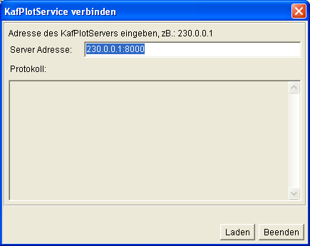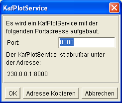 Unter Extras ist der Dialog "KafPlotService erzeugen" zu finden. In der führenden Session ist KafPlotService erzeugen zu starten. Alle anderen Sessions können danach mit KafPlotService verbinden an die führende Session angemeldet werden. Für diese Lösung wurden MultiCastSockets verwendet mit der Nachrichten von einem Server an mehrere Clients verteilt werden können. Nicht alle Nertwerke unterstützen diese Lösung. |