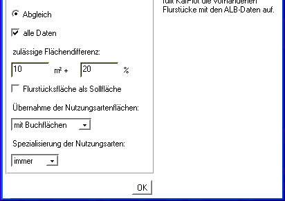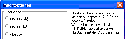Die Schalterstellung Abgleich ist sicher die am häufigsten verwendete Möglichkeit des ALB-Imports. Hier werden alle in der Auftragsdatei enthaltenen Flurstücke mit den aus der WLDGE-Datei importierten Flurstücken abgeglichen und nach dem Speichern ergänzt.