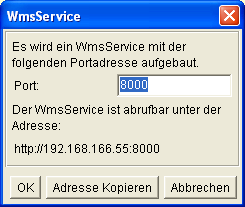 Hierfür ist unter Extras der Dialog "WMS erzeugen" zu finden. Mit dem Schalter Adresse kopieren wird die Portadresse in die Zwischenablage kopiert und kann in anderen Anwendungen eingefügt werden. |
