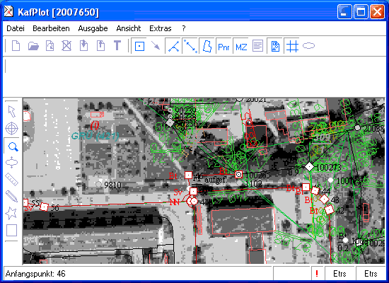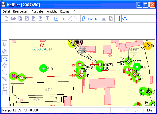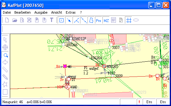 Im Auswerteprozess steht mit KafPlot eine ständig aktuelle Visualisierung sämtlicher durch KAFKA erzeugter statistischer Kennwerte zur Verfügung. Alle Kenngrößen des Beobachtungsmaterials, wie die Standardabweichung, Normierte Verbesserung, Kontrolliertheit und Einfluss auf die Punktlage werden farblich gekennzeichnet, so dass sicher die Aufdeckung von Fehlerursachen und die Beurteilung der Auswirkungen möglich ist. KafPlot berechnet auch die Auswirkungen der Koordinatenänderungen auf die Flächengrößen der Flurstücke und visualisiert deren Abweichungen. Jederzeit ist eine Darstellung des Ausgangszustandes im Vergleich zu den neu berechneten Geometrien der Liegenschaften möglich.