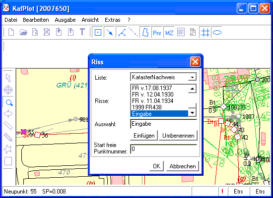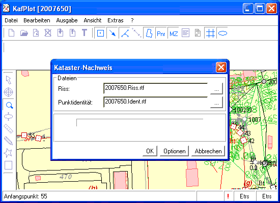 KafPlot unterstützt die Ausgabe der von den Vorschriften der Länder Brandenburg und Nordrhein-Westfalen geforderten Unterlagen bei der Einreichung von Liegenschaftsvermessungen. KafPlot erstellt alle notwendigen Formulare, wie Riss-Liste, Nachweis der Punktidentität, Fortführungsbeleg, sowie die Koordinatendateien im Edbs- bzw. Gsb-Format. Die Übergabe der Punktdaten erfolgt mit allen geforderten Attributen. Die Übereinstimmung mit den Vermessungsvorschriften wird im Auswerteprozess und bei der Übergabe geprüft. Dabei werden alle relevanten Informationen in der Kafka-Datei gespeichert, so daß sie zu jedem Zeitpunkt vollständig zur Verfügung stehen. Das minimiert den Arbeitsaufwand bei Prüfung und Nachbearbeitung erheblich.